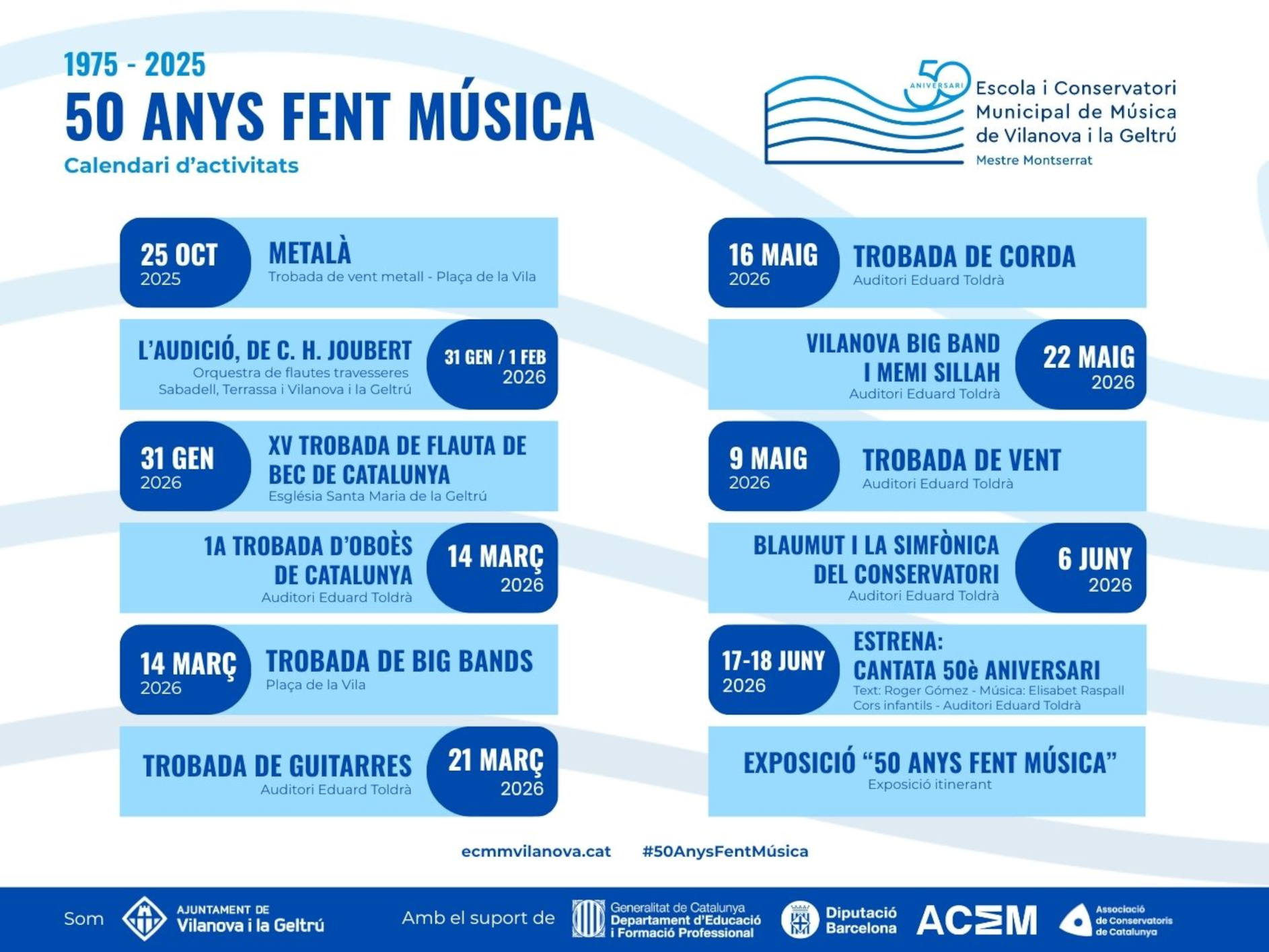 Aquest 50è aniversari és una ocasió única per mirar enrere amb orgull, celebrar el present i projectar el futur d'una escola que continua creixent amb l'objectiu de seguir fent de la música un llenguatge comú i un patrimoni compartit.